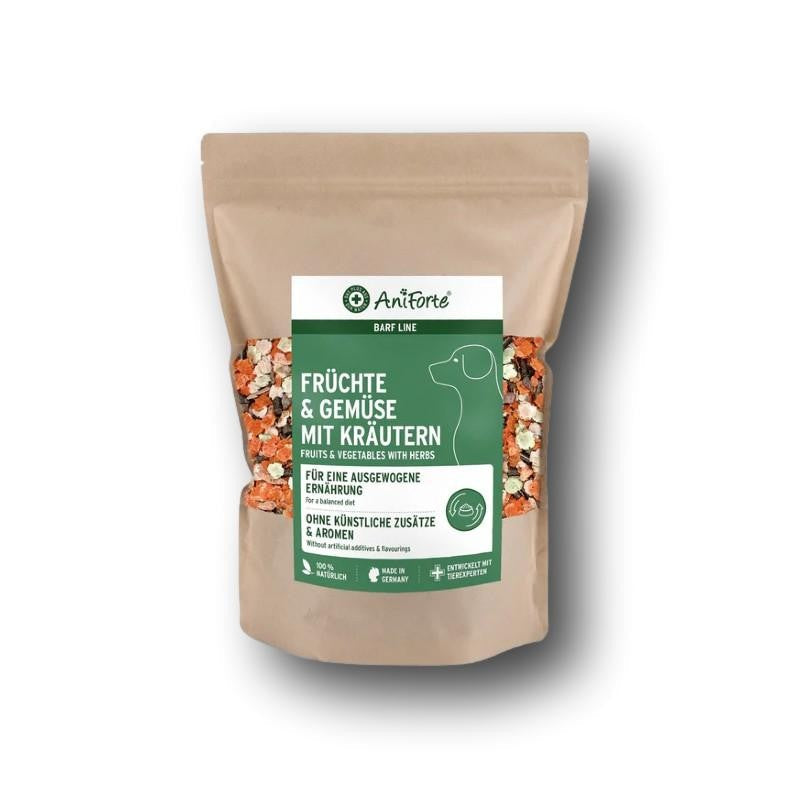 AniForte Barf-Line – fruits et légumes aux herbes pour chiens. AniForte Fruits & Légumes aux Herbes est un aliment complémentaire naturel sans additifs artificiels tels que colorants, conservateurs et arômes. La composition sans gluten offre une véritable alternative alimentaire pour les chiens – idéale pour l’alimentation crue ou pour mélanger avec de la viande en conserve. Les fruits contenus sont bien entendu non soufrés et non sucrés.