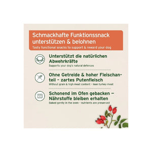 Die keksartigen Fleisch-Sticks vereinen die bewährte Hagebutte und Meerrettich mit traditionellen Kräutern wie Kapuzinerkresse und Cistuskraut. Ergänzt mit probiotischen Bakterien, MSM (Methylsulfonylmethan) und dem Spurenelement Zink, entsteht eine durchdachte Rezeptur zur Unterstützung der Abwehrkräfte. Die clevere Art zu belohnen – für ein starkes Immunsystem!