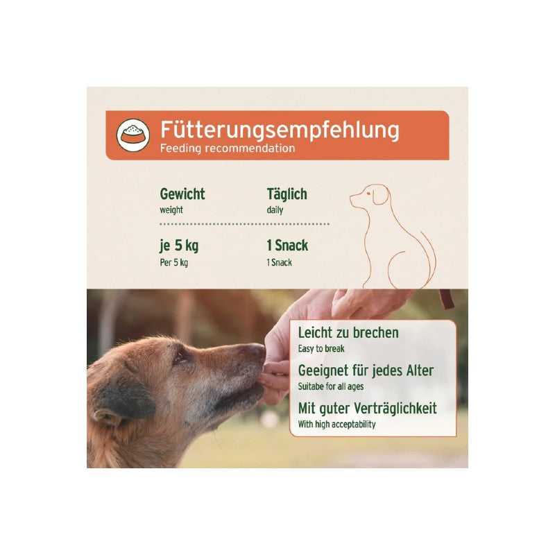 Die Snacks können einfach während des Spaziergangs, als Belohnung oder beim Training gegeben werden. Bitte immer ausreichend Trinkwasser zur Verfügung stellen.