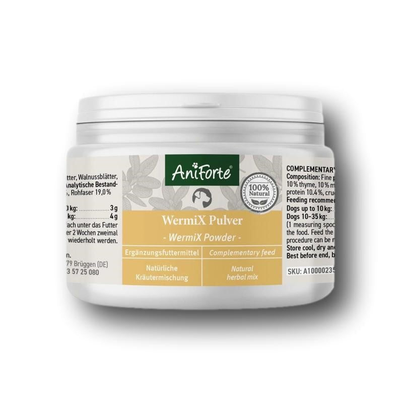 La formule contre les vers AniForte - WermiX offre la meilleure qualité et peut être mélangée à la nourriture normale de votre chien. Des milliers de clients satisfaits font déjà confiance à ce classique d'AniForte, qui est exempt d'additifs synthétiques et bénéficie d'un niveau d'acceptation élevé. La meilleure condition préalable à une vie de chien saine après une infestation de vers guérie est de soutenir les besoins nutritionnels en saponines, substances amères et tanins le plus rapidement possible. Les ingrédients purement végétaux contenus dans la poudre AniForte WermiX peuvent contribuer à un apport optimal de nutriments après une infestation de vers guérie. La poudre AniForte WermiX contient uniquement des ingrédients à base de plantes tels que le thym, l'armoise, l'absinthe et la sauge et est particulièrement utile après une infestation de vers guérie.