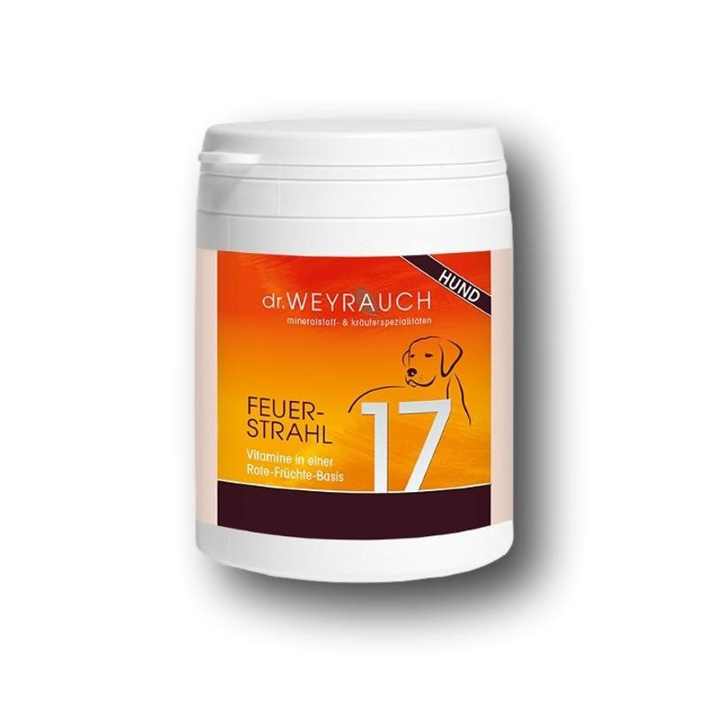 Dr. Weyrauch Nr. 17 Feuerstrahlfür den Hund ist ein Vitaminbooster, in dem besonders die Vitamine des B-Komplexes in eine Grundlage aus roten Früchten und Lezithin eingebettet sind. Vitamine müssen dem Hund als sogenannte essentielle Nährstoffe vorwiegend durch die Fütterung zugeführt werden. Es werden die wasserlöslichen von den fettlöslichen Vitaminen unterschieden. Hunde sind im Gegensatz zum Menschen in der Lage, Vitamin C selbst zu synthetisieren. Im Vergleich zum Pferd ist er jedoch (ähnlich wie der Mensch) nicht in der Lage, selbstständig die B-Vitamine zu synthetisieren.