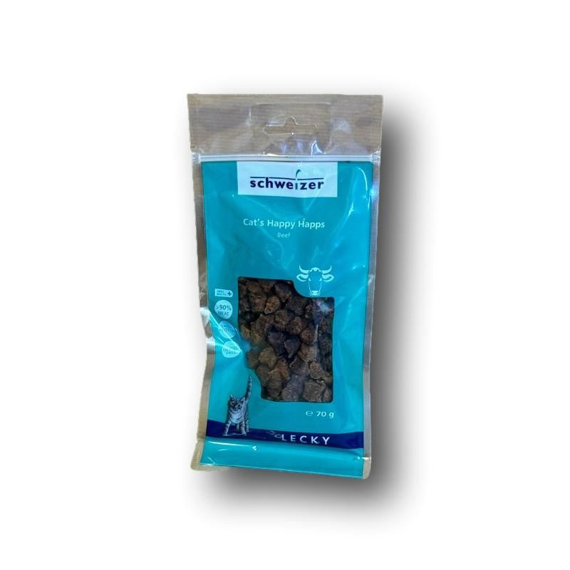 Les Lecky Cat Happy Happs Beef sont des mini bouchées moelleuses et délicatement séchées, fabriquées à 93 % à partir de bœuf suisse. Un régal pour tous les chats !