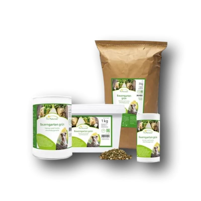 PerNaturam Bauerngarten vert est un mélange de légumes et de fruits verts délicatement séchés (sans pigments rouges). Bauerngarten enrichit l'alimentation avec des minéraux et des oligo-éléments naturels. La teneur élevée en fibres stimule le péristaltisme intestinal et favorise la vidange indépendante des glandes anales.