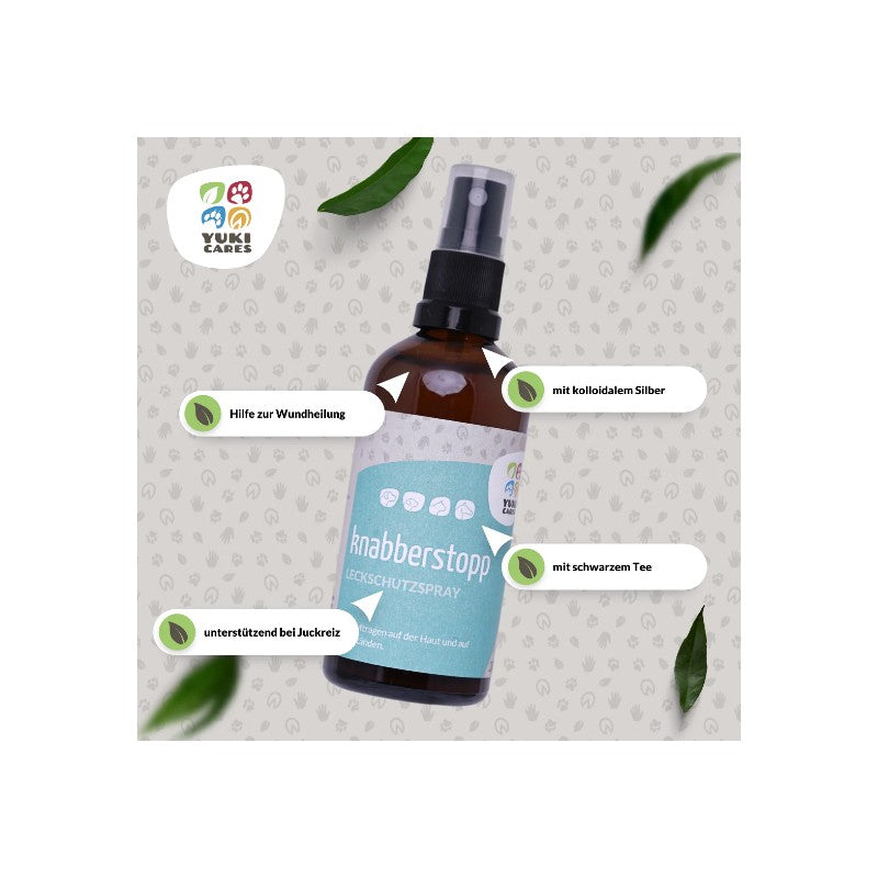 YukiCares Knabberstopp Leckschutzspray ist ein natürliches Anti-Knabber-Spray für Hunde, das mit Bitterstoffen effektiv verhindert, dass dein Hund sich in die Pfoten beisst, und so Hautirritationen vorbeugt.