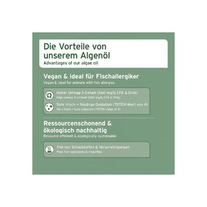 L'olio di alghe AniForte per cani e gatti è l'alternativa vegana per gli animali con allergie o intolleranze al pesce. Le alghe hanno una fotosintesi unica e presentano un contenuto particolarmente elevato di acidi grassi omega-3.